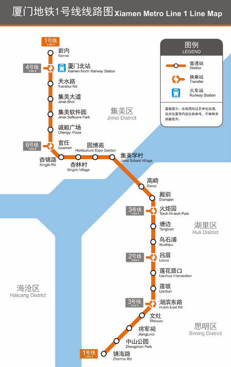 This 30.3 kilometer subway line links the northern Jimei District to the southern downtown area. It takes about 50 minutes to pass through all 24 stations built along the new line. The line runs through several famous sightseeing spots such as Jimei Study Village and Zhongshan Road. There is a stop at Xiamen North Rail Station, making this line the gate of Xiamen city towards those coming by train.
