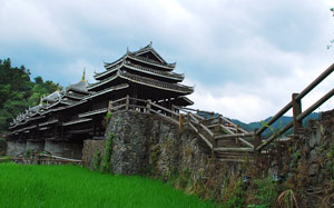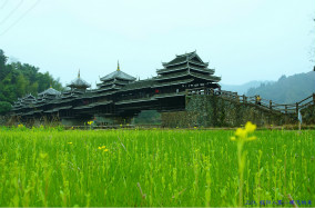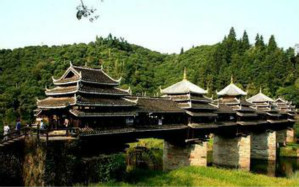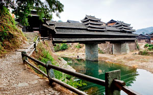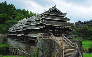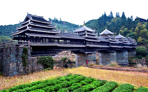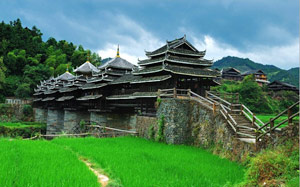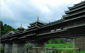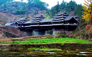 The Chengyang Wind and Rain Bridge is a combination of bridge, corridor, veranda and pavilion. Talented Dong people built the bridge without any nails or rivets. Though several decades old, the bridge is still very steady and looks like a brilliant rainbow crossing over the river.