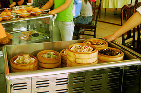 One aspect unique to dim sum is its method of serving. Here, dishes are pushed around the restaurant in steam-heated carts, with servers offering the dishes to customers.