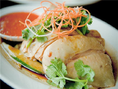 The Wenchang Chicken is so named because it was first produced in Wenchang City. The chicken is free-range and on a high protein diet. The most traditional way to prepare Wenchang Chicken is "white cutting", which involves immersing the chicken in almost boiling hot water and cooked to preserve its softness and tenderness. It is then eaten by dipping the pieces in a mixture of spices including ginger and salt. All star-rated hotels and the major Hainan style restaurants can serve this dish.