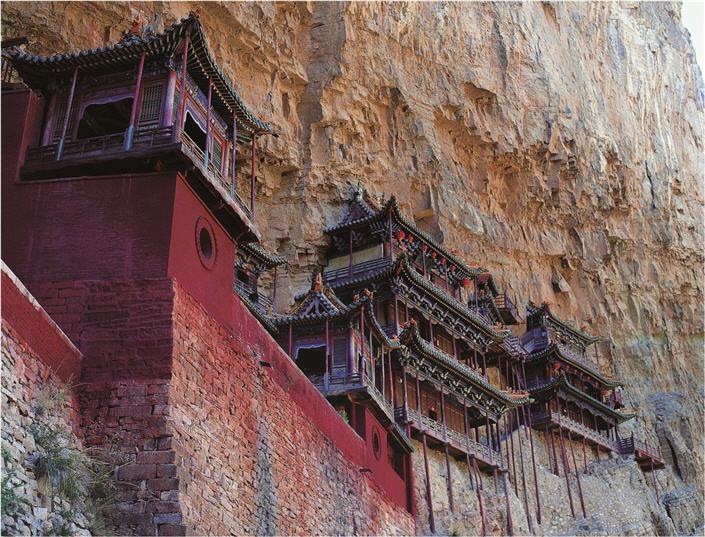 The Hanging Temple was designed skillfully and constructed audaciously. The method is to chisel a horizontal hole in the cliff, and then put a beam through the hole out of the cliff, at last put board and pillars on the beam to build various beam frames and roofs.
