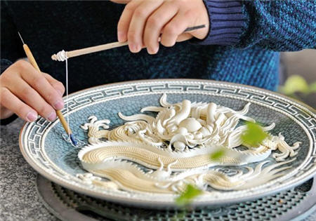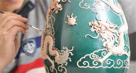 In recent years, lacquer thread sculptures have been applied to plates, vases, stoves and other stoneware and glass vessels. The craft of traditional lacquer thread sculpture includes designing sculpture, foundation make-up, twisting lacquer thread, sculpting lacquer thread, filling in the color and covering the thread with gold. Each sculpture is a genuine handmade artwork, and integrates the techniques of sculpting, painting and embroidery.