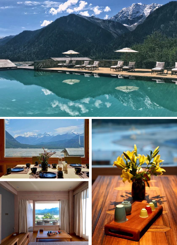 Our highest property set on a cliff side facing glaciers and nestled among the area’s snow-capped mountains and lakes. The lodge also uses state of art oxygen concentrator technology to achieve a 24-hour closed oxygen supply. The floor heating is imported from Denmark and the floor-to-ceiling triple-layered vacuum glass windows provide warmth and UV protection whilst at the same time offering breathtaking views of Rawu Lake.