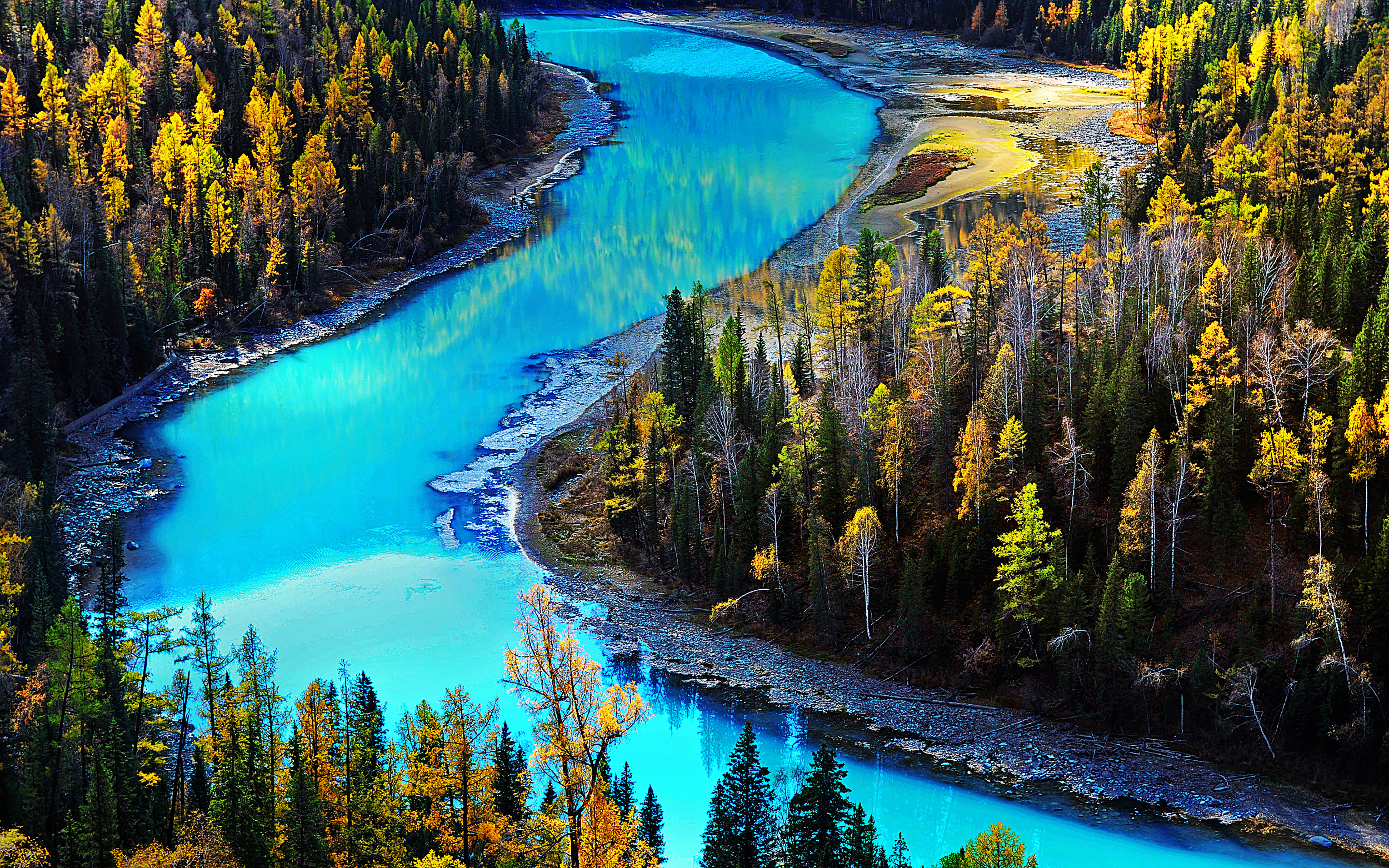 The Multy Color Bay, located 24 kilometers northwest of Burqin County in Xinjiang along the northern bank of the Irtysh River, is a river beach known for its yardang landforms. The unique hilly geological formations here boast a variety of colors, especially stunning when illuminated by the evening sun, creating a spectacular and fantastical sight. Across the river lies a lush poplar forest, reflecting beautifully in the water, making it a fairy-tale-like scene in autumn. The vibrant yellow leaves make it a perfect spot for photography enthusiasts.