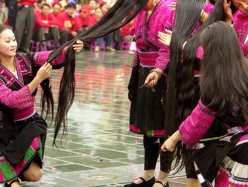 For Hongyao, Long hair stands for long life, wealth prosperous and auspicious. From about twelve they start to keep their hair long, if hair grows too long they cut a part from the bottom and keep them. Hongyao’s hair features black. White hair is seldom found even they get old, the secret lies in the wooden comb and special shampoo made of herbal and water used to wash rice.