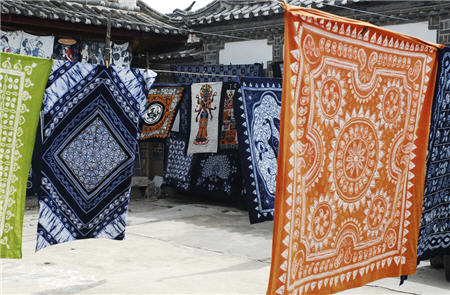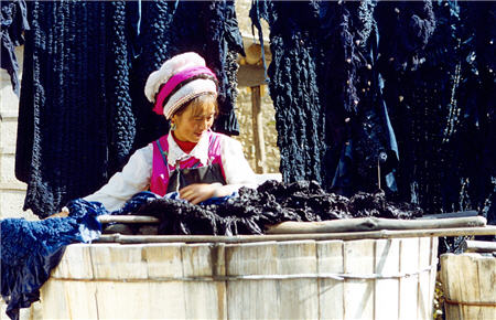 The craft of tie-dyeing is a precious legacy in Zhoucheng Village in Dali Bai Autonomous Prefecture, Yunnan. Its population is only about 10,000 and there are more than 6,000 people employed in the tie-dyeing business. Due to its fine workmanship, Zhoucheng has become the main producing place of the tie-dyed cloth, known as 'the Land for National Tie-dye.'